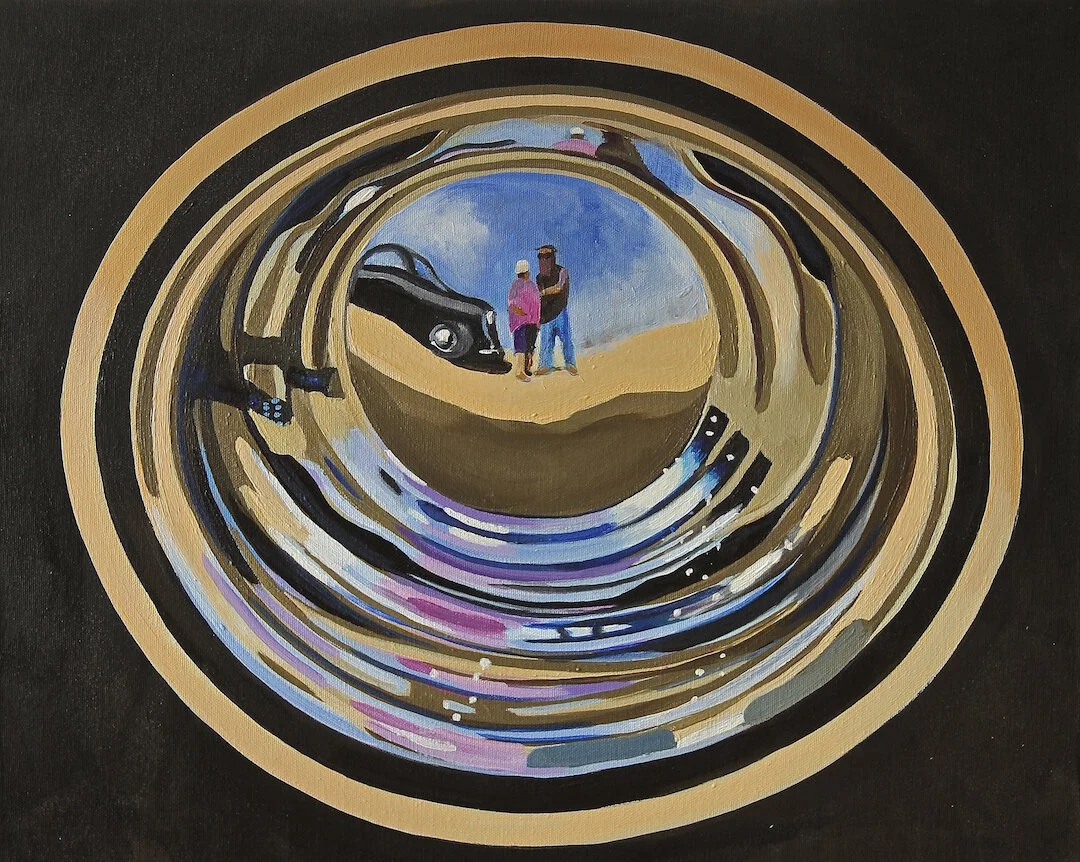 The reflections of car enthusiasts (the artist and her husband to be specific) in a shiny hubcap at the Syracuse Nationals.